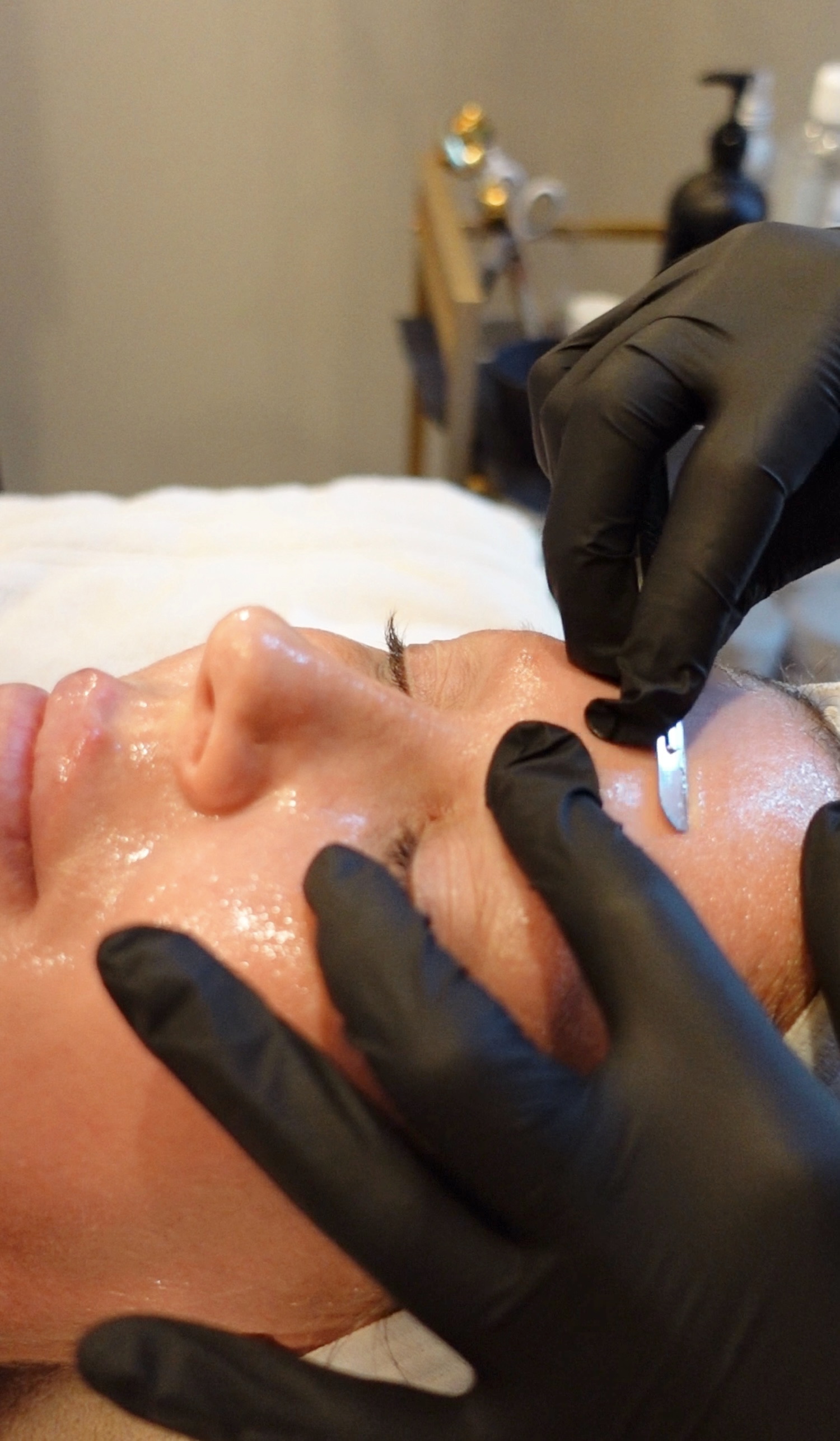Appointments take about 30 minutes. After cleansing, your esthetician holds the blade at a 45-degree angle and moves in short, feather-light strokes across your face, avoiding the eyelids, nose, and lips. There's no pain, no downtime, and no peeling afterward. We finish with a hydrating serum and SPF.